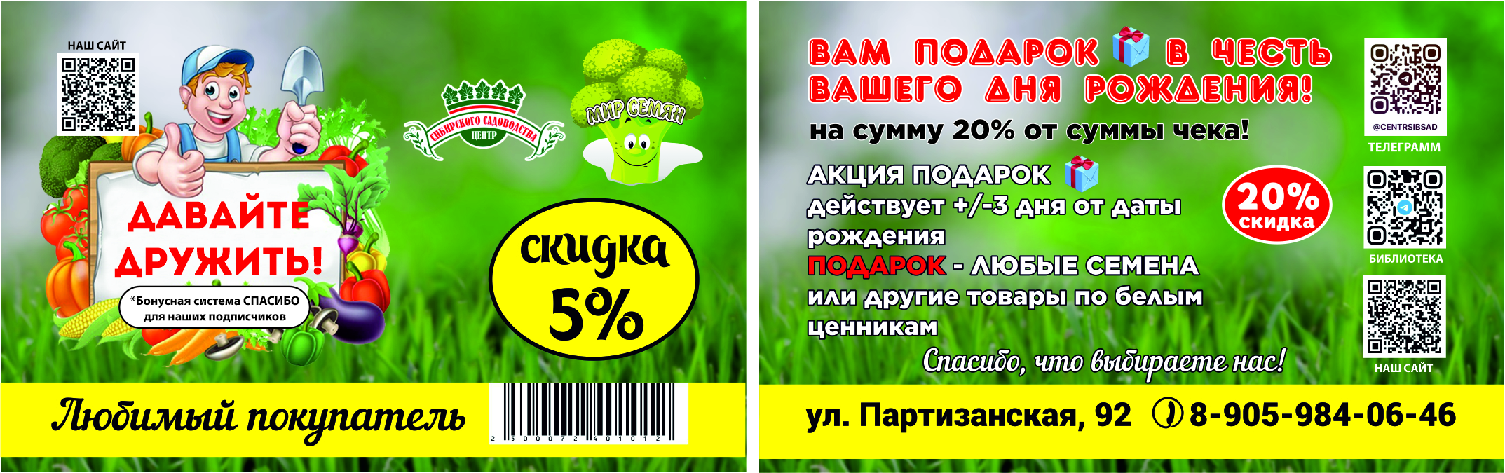 Электронная карта действительна для предъявления на кассе в магазине и получения скидки 10% на семена.