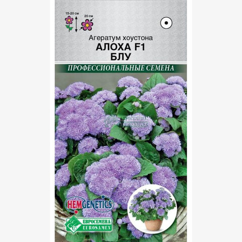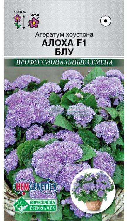 Аgeratum houstonianum Aloha F1 Blue Aloha – один из самых ранних среди производственных сортов и гибридов низкорослых агератумов. Растение формирует компактный куст, при выращивании в кассете достигающий высоты 7-10 см. Цветки насыщенной сине-фиолетовой окраски, собраны в крупные щитковидные соцветия, пушистые по своей структуре. Голубые коврики этого растения очень любят озеленители, это уникальный цветок для создания ландшафтных композиций, а цветоводы-любители выращивают его ради пушистых цветочков, похожих на помпоны. Продолжительное цветение, тонкий, нежный аромат и красивые, оригинальные цветы являются достойной платой за внимание и заботу. Отлично подходит для оформления бордюров и первой линии клумб. Растение также отлично смотрится в контейнерах на балконах или фасадах домов, наполняя сад небесной синевой и пленяя своей особой, неброской красотой. Название растения в переводе с греческого значит "нестареющий", он на самом деле радует глаз своими пышными соцветиями с июня до поздней осени. В народе его нередко называют долгоцветкой.