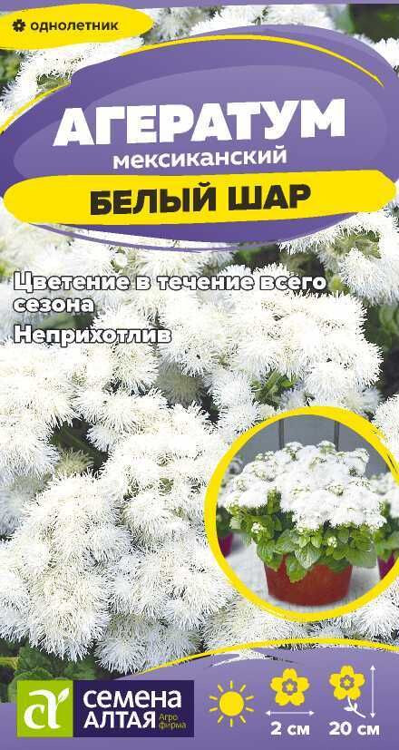 Декоративное растение, выращиваемое как однолетник. Формирует небольшой разветвленный кустик, высотой около 20 см, с крепкими побегами. Особую декоративную ценность агератуму придают душистые белые цветки-корзинки, диаметром не более 2 см. Они собраны в верхушечные плотные соцветия, которые расположены буквально по всему кустику. Является непременным компонентом парадных клумб, бордюров и ковровых цветников. Неприхотливое, устойчивое к жаре и засухе растение, но любит обильный полив. Хорошо растет на легких плодородных почвах при хорошем освещении. Даже при небольшом затенении вытягивается, недружно зацветает и не достигает полноценной декоративности. Легко переносит стрижку, что делает кусты более декоративными. Выращивают посевом семян в конце марта – начале апреля в рассадные ящики. Перед посевом семена на полчаса помещают в раствор перманганата калия, затем просушивают и смешивают с крупнозернистым песком. Грунт перед посевом слегка увлажняют из распылителя. Смешанные с песком семена равномерно высевают в контейнер с грунтом и слегка прижимают к его поверхности. Сверху посевы также необходимо увлажнить из распылителя и накрыть плёнкой до появления всходов. Ежедневно пленку нужно снимать для проветривания посевов и удаления конденсата. При температуре почвы +18-21°С всходы появляются на 10-14 день. Через 3 недели их пикируют. В открытый грунт рассаду высаживают в начале июня, после окончания весенних заморозков, выдерживая посадочный интервал 15-20 см. Цветение с начала июня и до осенних заморозков.