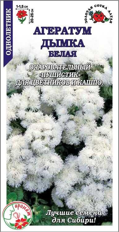 Очаровательное растение, формирующее пышные округлые кустики с крепкими побегами. Миниатюрные белые цветочки собраны в пушистые щитковидные соцветия, достигающие 7-10 см. Аромат нежный, с легкими медовыми нотками. Агератум используется для создания цветников, посадки в контейнеры и срезки в букеты. Цветет обильно и очень длительно.