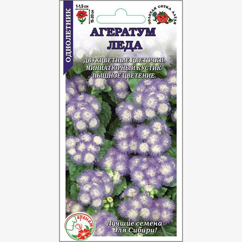 Один из самых красивых агератумов: белые с сиренево-голубой каймой цветочки, собранные в крупные ( до 8 см) пышные соцветия, практически полностью скрывают листву. Кустик миниатюрный, компактный. Цветение обильное и продолжительное. Аромат приятный, нежный. Используют для создания ковровых цветников и бордюров, высаживают в контейнеры.