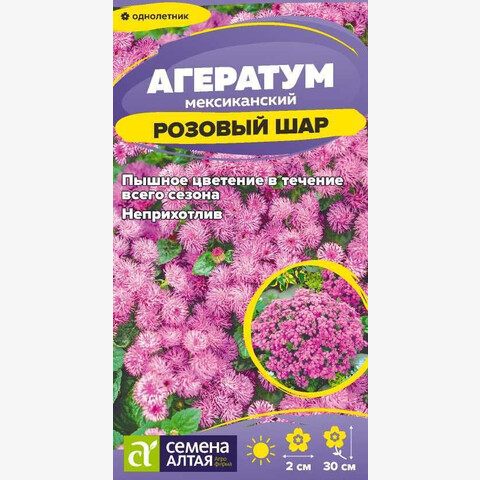 Декоративное растение, выращиваемое как однолетник. Формирует небольшой разветвленный кустик, высотой 20-30 см, с крепкими побегами. Особую декоративную ценность агератуму придают душистые розовые цветки-корзинки, диаметром не более 2 см. Они собраны в верхушечные плотные соцветия, которые расположены буквально по всему кустику. Является непременным компонентом парадных клумб, бордюров и ковровых цветников. Неприхотливое, устойчивое к жаре и засухе растение, но любит обильный полив. Хорошо растет на легких плодородных почвах при хорошем освещении. Даже при небольшом затенении вытягивается, недружно зацветает и не достигает полноценной декоративности. Легко переносит стрижку, что делает кусты более декоративными. Выращивают посевом семян в конце марта – начале апреля в рассадные ящики. Перед посевом семена на полчаса помещают в раствор перманганата калия, затем просушивают и смешивают с крупнозернистым песком. Грунт перед посевом слегка увлажняют из распылителя. Смешанные с песком семена равномерно высевают в контейнер с грунтом и слегка прижимают к его поверхности. Сверху посевы также необходимо увлажнить из распылителя и накрыть плёнкой до появления всходов. Ежедневно пленку нужно снимать для проветривания посевов и удаления конденсата. При температуре почвы +18-21°С всходы появляются на 10-14 день. Через 3 недели их пикируют. В открытый грунт рассаду высаживают в начале июня, после окончания весенних заморозков, выдерживая посадочный интервал 15-20 см. Цветение с начала июня и до осенних заморозков.