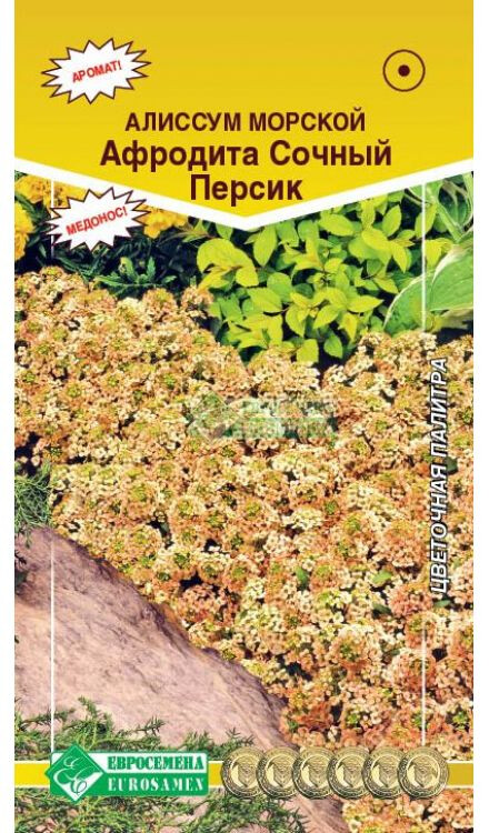 Lobularia maritima Aphrodite Peach В садовой культуре алиссум морской стал известен не так давно, но популярность его растет с каждым годом, и причиной этому, кроме непритязательности и простоты в уходе, является сильный медовый аромат, который источает растение. Алиссум – прекрасный медонос, привлекающий пчел своим пряным ароматом, обильно цветущий до заморозков, многочисленные цветки которого собраны в рыхлые кисти соцветий, великолепно сочетающиеся с обриеттой, резухой и флоксами, другими стелющимися растениями, стойко переносит засуху и не боится холодов. Он хорошо смотрится на клумбах и альпинариях в качестве обрамляющей полоски. Часто его высаживают на бордюрах, подходит для выращивания в висячих корзинах, в контейнерах, в альпинарии, в трещинах дорожек и между камнями. Высота растения-30 см