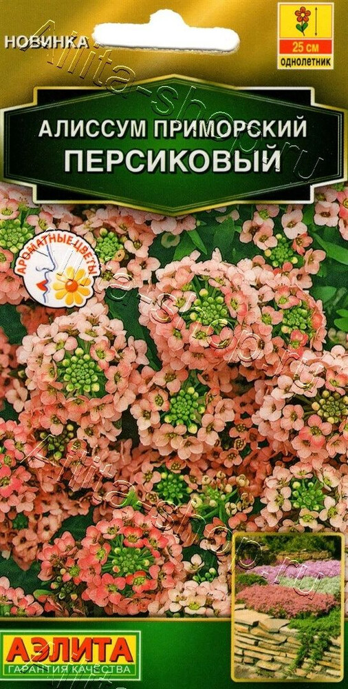 Миниатюрный однолетний алиссум редкого оттенка. Медовый запах его цветков привлекают полезных насекомых и наполняет сад изысканным ароматом. Высота пушистых кустиков около 15-25 см, в ширину они разрастаются до 25-30 см. Для растений характерны: очень ранний срок начала цветения, однородность и компактность габитуса на протяжении сезона. Это великолепная почвопокровная и бордюрная культура. Используется для оформления подпорных стенок, вазонов, каменистых горок. ри создании масштабных ландшафтных композиций применяются сплошные ковровые посадки алиссумов разнообразных оттенков.