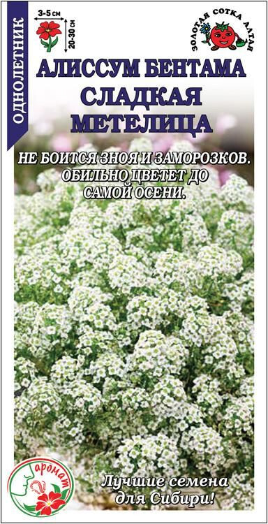 Алиссум Бентама не боится зноя и заморозков, цветет очень обильно и длительно. Растения великолепно ветвятся и при высоте 20-30 см разрастаются вширь до 40 см, образуя плотный стелющийся ковёр. Крохотные белоснежные цветочки, собранные в многочисленные соцветия-кисти, источают сильный медово-сладкий аромат. Используют в одиночных и групповых посадках, на каменистых горках и ковровых цветниках, высаживают в кашпо.