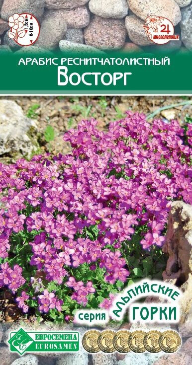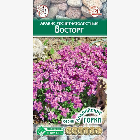 Существует множество видов арабиса, но, не смотря на большое количество видов этого растения в естественной среде, для декоративного выращивания приспособлены не более 7-10 из них, однако, существуют различные формы и сорта, выведенные на основе окультуренных разновидностей арабиса. Восторг- популярный и эффектный многолетник родом из горных районов Калифорнии. Особую привлекательность ему придает ковер из темно-зеленых, густо опушеных, имеющих серый оттенок, листьев, полностью скрывающийся за многочисленными мелкими цветками в период цветения. Цветы окрашены в темно-розовый цвет и обладают сильным, приятным ароматом. Это невысокое растение образует пышные куртины, прекрасно выглядит пышным покрывалом и красиво может заполнить пустоты, сочетаясь с различными яркими цветами, создавая интересную композицию. Хорошо будет смотреться в миксбордерах, бордюрах, каменистых горках, в посадках с тюльпанами. Это отличный вариант для оживления бедных питательными веществами грунтов, на которых большинство других растений попросту не растет. Благодаря своей неприхотливости сорт популярен как растение для укрепления склонов, как элемент рокария или альпийской горки.
