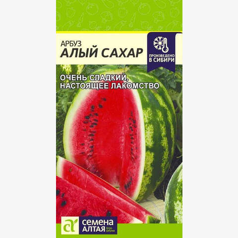 Раннеспелый сорт, период от всходов до первого сбора урожая 67-82 дня. Плоды округлые, выравненные, с зелеными полосами, массой 4-6 кг. Мякоть красная, нежная, очень сладкая. Дружносозревающий, урожайный сорт не оставит вас равнодушным к нему. Место посадки: песчаные, хорошо аэрированные почвы, участок должен быть защищён от ветров Освещение: обильное, плохо переносит затенение Предпосевная подготовка: перед посевом семена в течении 10 минут обрабатывают в 0,5% растворе марганцовокислого калия, затем промывают чистой водой Сроки посева: при прогревании почвы на глубине 8-10 см до 15°С Посев на рассаду: за 25-30 дней до высадки (апрель-май). Посев проводят в рыхлую питательную почву, до появления семядолей температура воздуха и почвы должна составлять 23–27°C Посев в грунт: когда минует угроза возвратных заморозков, а почва прогреется до 15..18°C (июнь). Посев проводят на глубину 1,5-2 см. До появления всходов лунки накрывают стеклом, пленкой для сохранения влаги, тепла и защиты всходов от птиц Пикировка/перевалка: рассаду высаживают, когда минует угроза возвратных заморозков, в фазе 3-4 настоящих листьев, соблюдая посадочный интервал 140х100 см в открытом грунте, в теплицах - 70х70 см (при использовании шпалер) Уход: почва под растениями должна быть всегда слегка увлажнена. Наиболее интенсивный полив следует обеспечить в период цветения и налива плодов