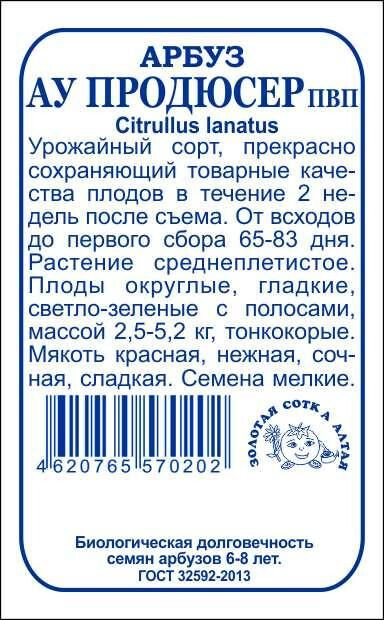 Урожайный сорт, прекрасно сохраняющий товарные качества плодов в течение 2 недель после съема. От всходов до первого сбора 65-83 дня. Растение среднеплетистое. Плоды округлые, гладкие, светло-зеленые с полосами, массой 2,5-5,2 кг, тонкокорые. Мякоть красная, нежная, сочная, сладкая. Семена мелкие.