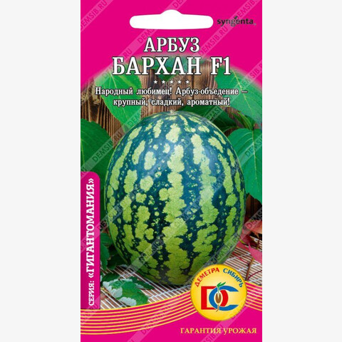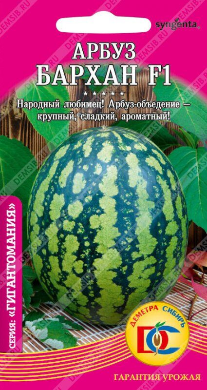 Арбуз-объедение, очень крупный и самый сладкий. Среднеспелый (68-97 дней от всходов, до первого сбора урожая) гибрид держит планку высочайшего качества и пользуется всенародной известностью, широчайшим спросом и популярностью. Растение плетистое, с длинной главной плетью. Плоды округлые, фон светло-зеленый до зеленого, полосы размытые, средней ширины, зеленые. Масса плода 2,9-7,5 кг (до 15 кг). Мякоть красная, сочная, ароматная, сахарная, отличного вкуса. Сохраняет товарные качества в течение 30 дней после съема.