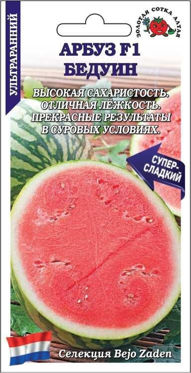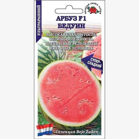 Великолепный ультраранний гибрид с повышенным содержанием сахаров. Растение мощное, дает отличный урожай даже в суровых погодных условиях. Плоды овальные, массой до 8-10 кг, светло-зеленые с темными узкими полосами, сохраняют товарные качества 40-45 дней после съема. Мякоть с маленькими семенами, темно-красная, плотная, хрустящая и очень - сладкая. Гибрид может выращиваться с загущением без потери урожайности и качества плодов.