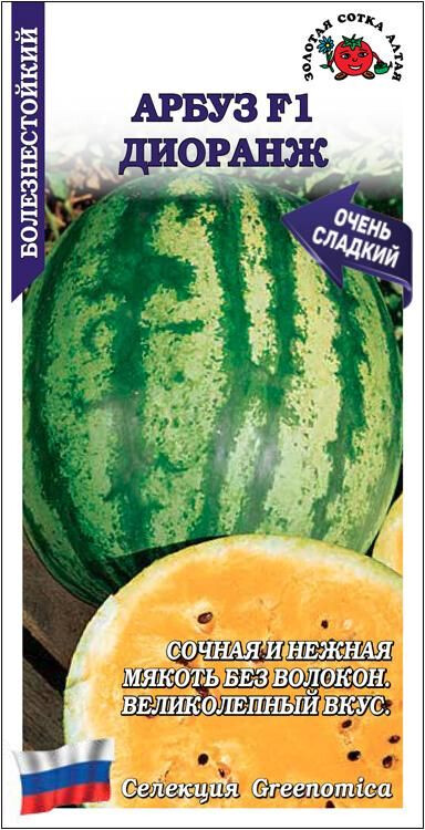 Интересный среднеспелый гибрид с повышенным содержанием сахаров, отличной транспортабельностью, болезнестойкостью и высокой урожайностью. Растение мощное, среднеплетистое, с хорошо развитой корневой системой. Плоды округлые, массой 7-9 кг, гладкие с рисунком в виде темно-зеленых полос на светло-зеленом фоне, кора достаточно прочная. Мякоть ярко- оранжевая, сочная и хрустящая, без волокон, очень нежная, великолепного сладкого вкуса.
