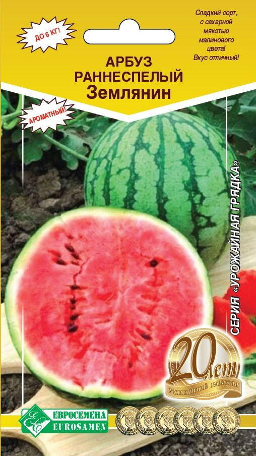 Арбуз — популярная бахчевая культура, относящаяся к семейству тыквенных. Плоды этого растения нравятся практически всем, а их появление на столе свидетельствует об окончании лета. Сочная и сладкая мякоть арбуза является лучшим вариантом для утоления жажды в жаркие дни. Это достаточно полезная ягода, поскольку в своем составе содержит много необходимых для организме человека компонентов и витаминов. Арбуз Землянин - ранний сорт арбуза с вкусной и сладкой мякотью - настоящий Праздник для детворы! Сбор урожая через 75-85 дней после всходов. Плод округло-овальный, массой 4-6 кг. Мякоть малиново-розовая, зернистая, нежной консистенции, сочная, отличного вкуса. Арбузные дольки съедаются через несколько секунд после торжественного разрезания. Растение мощное. Ценится за устойчивость к засухе, хорошую транспортабельность, универсальность.