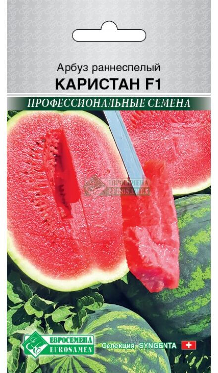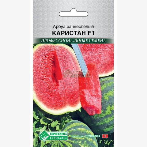 Арбуз – полезный продукт, дающий организму не только ощущение свежести, но и приносящий пользу для работы сердца, он способствует снижению уровня холестерина и соответственно снижает риск развития сердечно - сосудистых заболеваний. Каристан F1 – раннеспелый гибрид арбуза от компании Syngenta. Растение плетистое, сильное, с мощной корневой системой, устойчивое к антракнозу, фузариозному увяданию и солнечным ожогам, отлично формирует плоды даже при неблагоприятных условиях, хорошо переносит транспортировку (товарные качества сохраняет в течение 14 дней после съёма). Вес плода в среднем 2,8-5,1 кг, может вызревать до 8-13 кг, а по информации оригинатора гибрида – до 16 кг. Форма плода овальная. Мякоть тёмно-красной окраски, плотная по структуре, на вкус сочная, рассыпчатая, с высоким содержанием сахара. Семена мелкие, черные. Урожайность при выращивании на богаре 145-250 ц. /га, на капельном орошении – до 70 т/га. Норма высева на 1 га – 5-6 тыс. растений