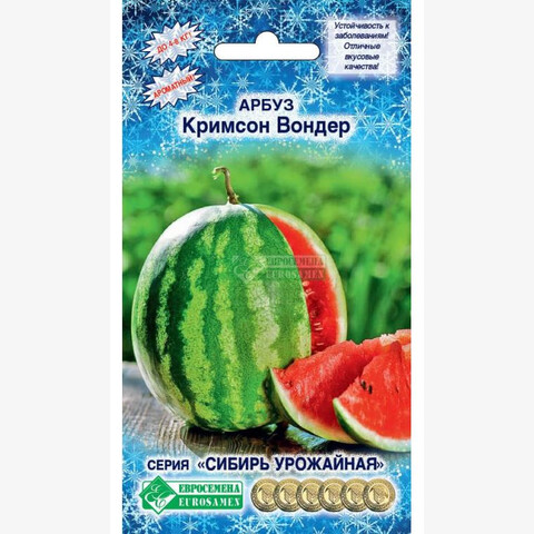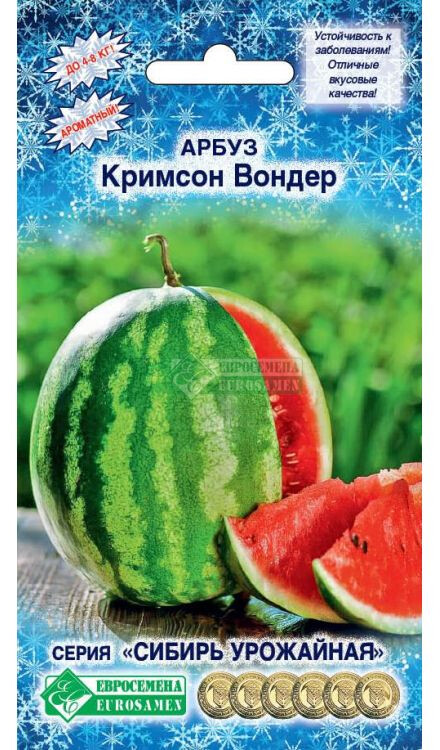 С приходом летних дней и до поздней осени сладковато-тропический запах сочного арбуза можно учуять на каждой кухне. Этот плод славится изумительным вкусом и тонким ароматом, который ассоциируется со свежим морским бризом, солнечными лучами и ощущением легкости и блаженства. У сибирских дачников пользуются популярностью такие сорта арбуза, для которых характерна хорошая переносимость неблагоприятных климатических условий, прежде всего. Арбуз Кримсон Вондер вполне соответствует этим параметрам. Это среднеспелый сорт, период от полных всходов до получения готовой продукции 85-91 дней. Плоды округлые, зеленые с темными широкими полосами. Кожура тонкая, мякоть красная, сахаристая и очень cладкая. В традиционных регионах выращивания средний вес плодов 4-8 кг. Отличается урожайностью, великолепным вкусом, устойчивостью к заболеваниям. Во время налива плодов поливы прекращают. Лишние завязи удаляют для роста и вызревания плодов (оставляют не более 2-х). Сбор урожая: по мере налива и созревания.