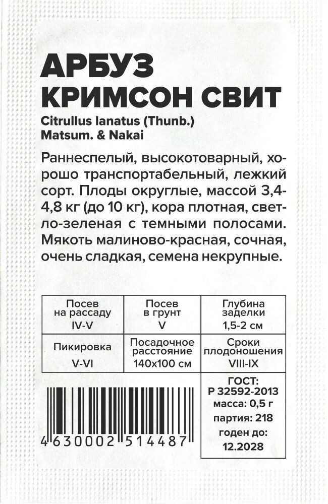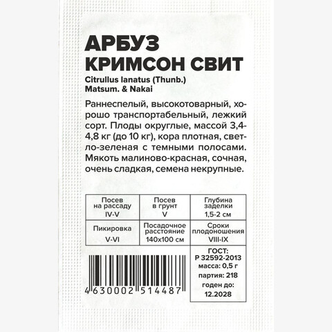 Раннеспелый, высокотоварный, хорошо транспортабельный, лёжкий сорт. Плоды округлые, массой 3,4-4,8 кг (до 10 кг), кора плотная, светло-зелёная с тёмными полосами. Мякоть малиново-красная, сочная, очень сладкая, семена некрупные. Место посадки: песчаные, хорошо аэрированные почвы, участок должен быть защищён от ветров Освещение: обильное, плохо переносит затенение Предпосевная подготовка: перед посевом семена в течении 10 минут обрабатывают в 0,5% растворе марганцовокислого калия, затем промывают чистой водой Сроки посева: при прогревании почвы на глубине 8-10 см до 15°С Посев на рассаду: за 25-30 дней до высадки (апрель-май). Посев проводят в рыхлую питательную почву, до появления семядолей температура воздуха и почвы должна составлять 23–27°C Посев в грунт: когда минует угроза возвратных заморозков, а почва прогреется до 15..18°C (июнь). Посев проводят на глубину 1,5-2 см. До появления всходов лунки накрывают стеклом, пленкой для сохранения влаги, тепла и защиты всходов от птиц Пикировка/перевалка: рассаду высаживают, когда минует угроза возвратных заморозков, в фазе 3-4 настоящих листьев, соблюдая посадочный интервал 140х100 см в открытом грунте, в теплицах - 70х70 см (при использовании шпалер) Уход: почва под растениями должна быть всегда слегка увлажнена. Наиболее интенсивный полив следует обеспечить в период цветения и налива плодов