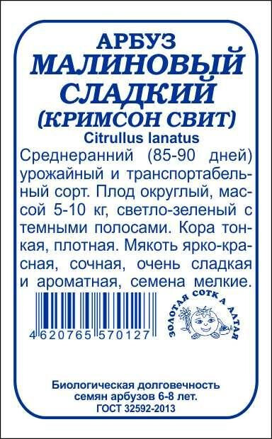 Сорт среднеранний, урожайный. От всходов до созревания 85-90 дней. Плоды округлые, крупные, массой- 5-10 кг. Поверхность светло-зеленая с темными полосами. Кора тонкая, плотная. Мякоть ярко-красная, ароматная, сочная и очень сладкая, семена мелкие. Сорт отличается хорошей транспортабельностью и дружным созреванием плодов.