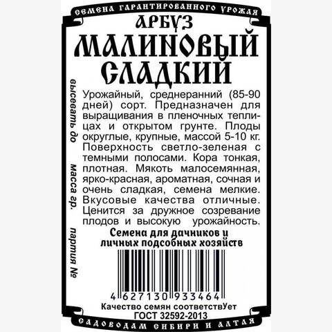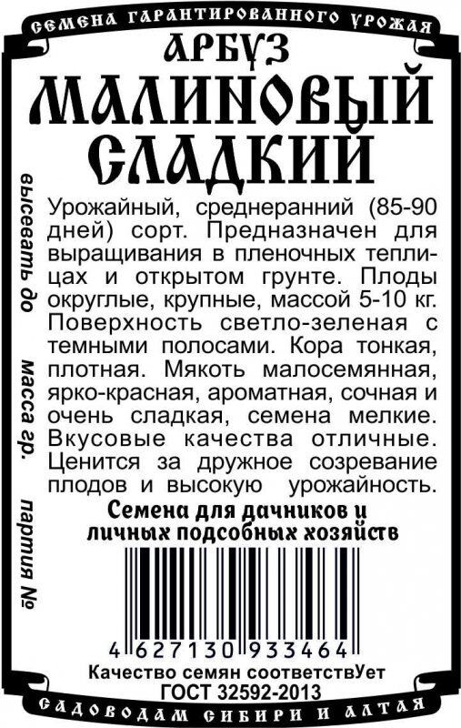 Урожайный, среднеранний (85-90 дней) сорт. Предназначен для выращивания в пленочных теплицах и открытом грунте. Плоды округлые, крупные, массой 5-10 кг. Поверхность светло-зеленая с темными полосами. Кора тонкая, плотная. Мякоть малосемянная, ярко-красная, ароматная, сочная и очень сладкая, семена мелкие. Вкусовые качества отличные. Ценится за дружное созревание плодов и высокую урожайность.