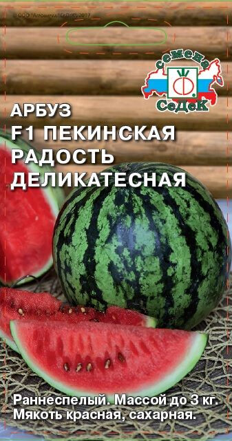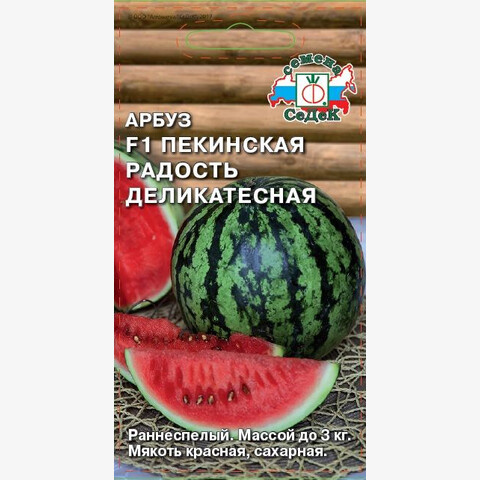 Арбузы серии «Пекинская радость» отличаются непревзойденными вкусовыми и товарными качествами. Раннеспелый (от всходов до созревания плодов 80-90 дней, от завязывания плодов до созревания 26 дней) гибрид для открытого и защищенного грунта. Плоды округлые, выравненные, зелёные с темными полосами, массой до 3 кг. Кора тонкая, плотная. Мякоть красно-малиновая, сахарная. Урожайность с растения 7-9 кг. Ценность гибрида: высокий процент сахаристости, сохраняет плотность мякоти при хранении. Рекомендуется для употребления в свежем виде и приготовления арбузного меда.