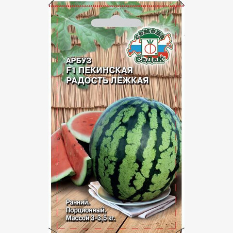 Арбузы серии «Пекинская радость» отличаются непревзойденными вкусовыми и товарными качествами. Раннеспелый (от всходов до созревания плодов 80-90 дней, от завязывания плодов до созревания 20-25 дней) гибрид для открытого и защищенного грунта. Плоды округлые, зелёные, с темными полосами, массой 3-3,5 кг. Кора толстая, плотная. Мякоть красная, зернистая, очень сладкая. Семена мелкие, темные. Урожайность с растения 9-12 кг. Ценность гибрида: устойчивость к заболеваниям, высокие вкусовые качества, отличная урожайность, пригодность к длительному хранению. Назначение универсальное.