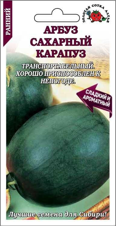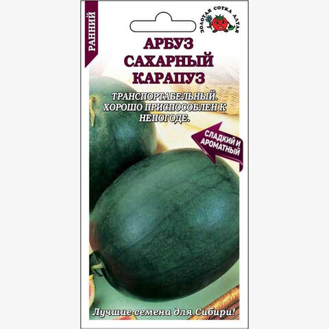 Раннеспелый транспортабельный сорт. От всходов до первого сбора 75-85 дней. Растение плетистое. Плоды темно-зеленые с тонкими скрытыми полосками, округлой формы, массой 3-5 кг. Мякотьярко-красная, нежная, сочная и сладкая, с сильно выраженным ароматом. Сорт хорошо приспособлен кнеблагоприятным погодным условиям!