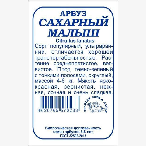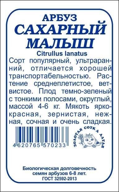 • Популярный ультраранний сорт. Срок созревания около 75 дней. Растение среднеплетистое, ветвистое. Плоды округлые, крупные, массой 4,0-6,0 кг. Поверхность темно-зеленая, с тонкими полосками. Мякоть ярко-красная, зернистая, нежная, сочная, очень сладкая. Сорт используется не только для непосредственного потребления, но и прекрасно подходит для засола. Отличается хорошей транспортабельностью.