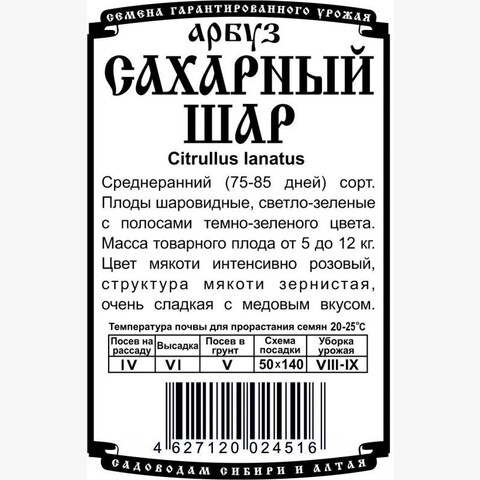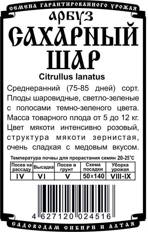 Сорт среднего срока созревания. Вегетационный период от 75 до 85 дней. Плод шаровидный. Фон плода светло-зеленый c полосами темно-зеленого цвета. Масса товарного плода от 5 до 12 кг. Цвет мякоти интенсивно розовый, структура мякоти зернистая, очень сладкая с медовым вкусом.