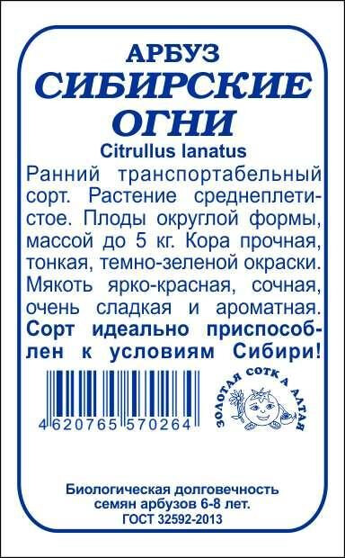 Сорт ранний, транспортабельный. Растение плетистое, главная плеть средней длины. Плоды округлые, гладкие, массой до 5 кг. Кора тонкая, прочная, гнущаяся, темно-зеленая со слабозаметными узкими полосами. Мякоть темно-красная, нежная, сочная, очень сладкая и ароматная. Сорт прекрасно приспособлен к суровым условиям Сибири, характеризуется высокой урожайностью и отличным вкусом, способен сохранять товарные качества плодов до 20 дней после съема.