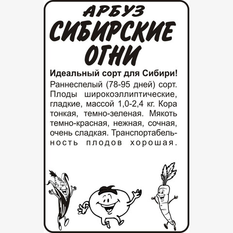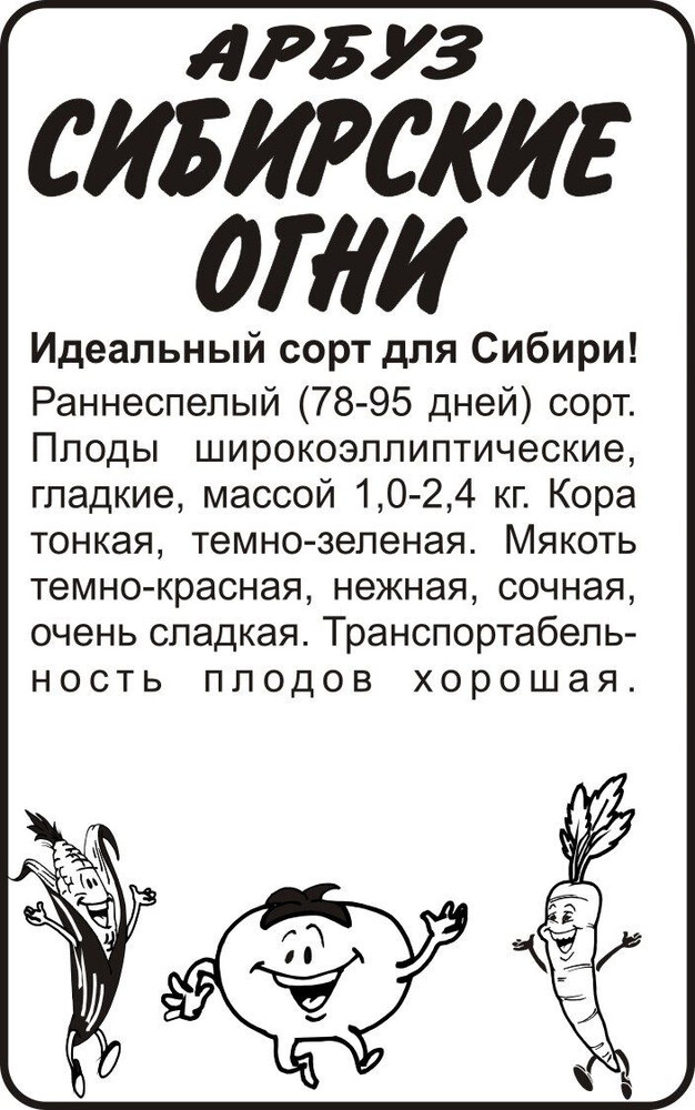 Селекция Западно-Сибирской овощной опытной станции. Раннеспелый (75-85 дней) сорт, растение среднеплетистое, до 2,5 м. Плоды шаровидной формы, массой до 5-6 кг. Кора тёмно-зелёная, толщиной 0,5-1,5 см. Мякоть ярко-красного цвета, сочная, сладкая. Транспортабельность плодов хорошая. Место посадки: песчаные, хорошо аэрированные почвы, участок должен быть защищён от ветров Освещение: обильное, плохо переносит затенение Предпосевная подготовка: перед посевом семена в течении 10 минут обрабатывают в 0,5% растворе марганцовокислого калия, затем промывают чистой водой Сроки посева: при прогревании почвы на глубине 8-10 см до 15°С Посев на рассаду: за 25-30 дней до высадки (апрель-май). Посев проводят в рыхлую питательную почву, до появления семядолей температура воздуха и почвы должна составлять 23–27°C Посев в грунт: когда минует угроза возвратных заморозков, а почва прогреется до 15..18°C (июнь). Посев проводят на глубину 1,5-2 см. До появления всходов лунки накрывают стеклом, пленкой для сохранения влаги, тепла и защиты всходов от птиц Пикировка/перевалка: рассаду высаживают, когда минует угроза возвратных заморозков, в фазе 3-4 настоящих листьев, соблюдая посадочный интервал 140х100 см в открытом грунте, в теплицах - 70х70 см (при использовании шпалер) Уход: почва под растениями должна быть всегда слегка увлажнена. Наиболее интенсивный полив следует обеспечить в период цветения и налива плодов