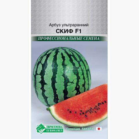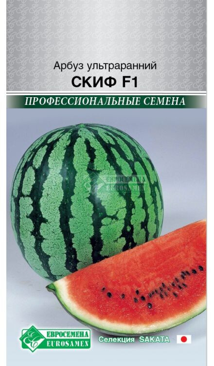 Арбуз – полезный продукт, дающий организму не только ощущение свежести, но и приносящий пользу для работы сердца, он способствует снижению уровня холестерина и соответственно снижает риск развития сердечно - сосудистых заболеваний. Скиф –современный гибрид арбуза очень раннего срока созревания. Плоды созревают, при прямом посеве семян в грунт, на 55 - 65 день после всходов, а при выращивании рассадным способом, под укрытиями, на 40 - 45 день. Мощное растение большой силы роста, с хорошо развитым листовым аппаратом, формирует при благоприятных условиях 4 - 5 плодов со средним весом каждого – 10-12 кг. Плоды овально-округлой формы, гладкие с глянцевым блеском, тёмно-зелёного со светлыми ровными полосами окраса, длительно сохраняют потребительские качества. Мякоть плодов насыщенного ярко-красного цвета, зернистая, сладкая, прекрасной консистенции и волшебного вкуса. Рекомендуется для выращивания ранней и суперранней продукции в открытом грунте и под плёночными укрытиями.
