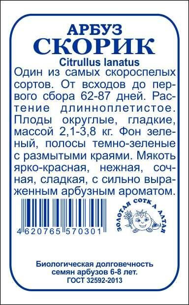 Один из самых скороспелых сортов. От всходов до первого сбора 62-87 дней. Растение плетистое, главная плеть длинная. Плоды округлые, гладкие, массой 2,1-3,8 кг. Фон зеленый, полосы темно-зеленые с размытыми краями. Кора средней толщины, кожистая. Мякоть ярко-красная, нежная, сочная, сладкая, с сильно выраженным арбузным ароматом. Сорт характеризуется дружным формированием урожая, устойчивостью к болезням и хорошей лёжкостью.
