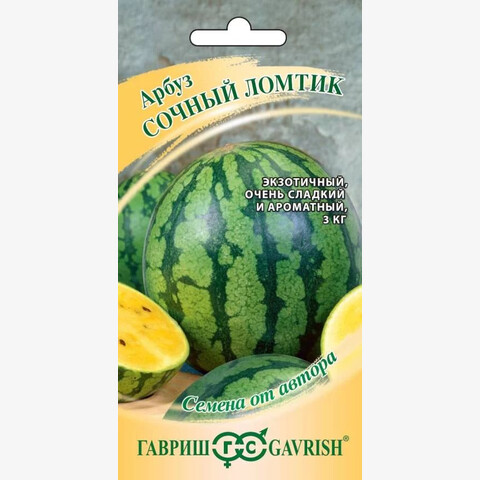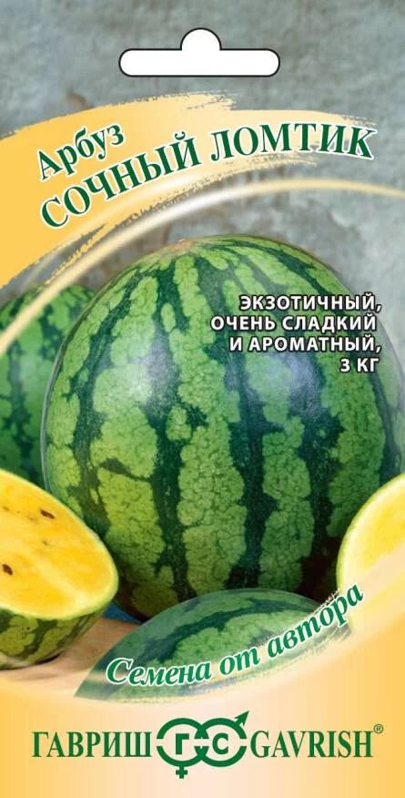 Ранний сорт с сахарной желтой мякотью, насыщенным арбузным ароматом и вкусом в котором улавливаются нотки тропических фруктов. Подходит для выращивания в открытом грунте в средней полосе и на юге России. Через 72-87 дней на растении созревают практически бессемянные овальные плоды массой 3 кг. Сорт урожаен, неприхотлив, плоды хорошо хранятся. Посев на рассаду производят в конце апреля. Высадку рассады в грунт — в конце мая – начале июня в возрасте 30-35 дней. Растения подвязывают к шпалере (до высоты 50 см), удаляют все боковые побеги, последующие прищипывают над 1-3 листом или выращивают врасстил.