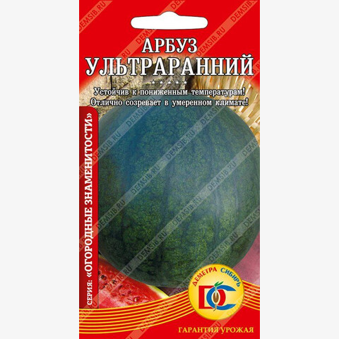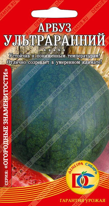 Самый скороспелый (80 дней) сорт. Растение компактное, с ограниченным развитием боковых побегов. Плоды круглые, темно-зеленые, с более темными полосами, массой 4-6 кг, мякоть ярко-красная, нежная, зернистая, очень сладкая. Ценится за высокую урожайность и отличные вкусовые качества. Для ускорения завязывания и созревания плодов, плети прищипывают после 6- го листа.
