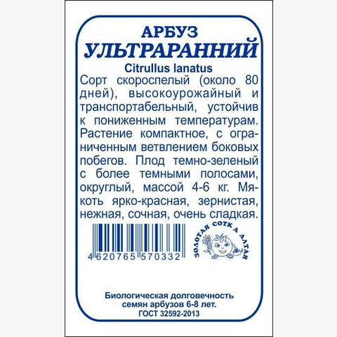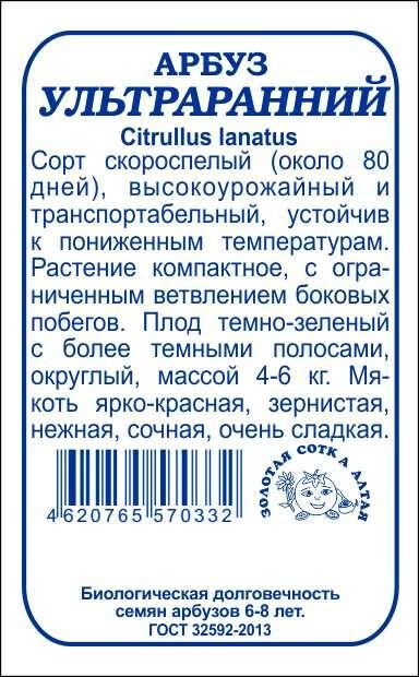 Скороспелый сорт. Срок созревания около 80 дней. Растение компактное, с ограниченным ветвлением боковых побегов. Плоды округлые, темно-зеленые с более темными полосами, массой 4-6 кг. Мякоть ярко-красная, зернистая, нежная, сочная, очень сладкая. Сорт ценится за высокую урожайность, хорошую транспортабельность и устойчивость к пониженным температурам.