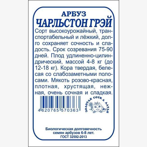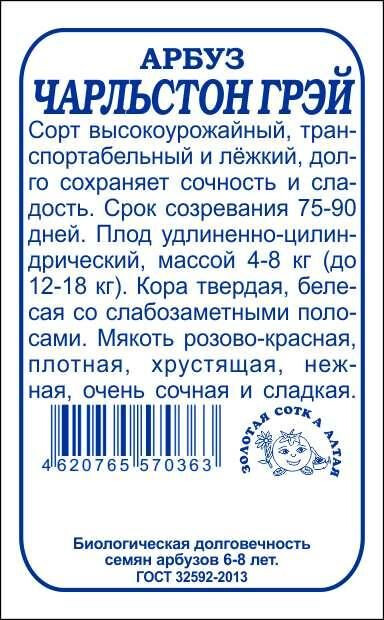 Великолепный высокоурожайный сорт. Срок созревания 75-90 дней. Плоды удлиненно-цилиндрические, массой 4-8 кг (до 12-18 кг). Кора твердая, белесая или светло-зеленая со слабозаметными полосами. Мякоть розово-красная, плотная, хрустящая, очень сочная и сладкая. Сорт славится хорошей транспортабельностью и лёжкостью до 2-2,5 месяцев с сохранением сочности и сладости. Благодаря светлой окраске плоды не нагреваются на солнце.