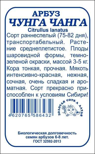 Сорт ранний, транспортабельный. Срок созревания 75-82 дня. Растение среднеплетистое. Плоды шаровидной формы, темно-зеленой окраски, массой 3-5 кг. Кора тонкая, прочная. Мякоть интенсивно-красная, нежная, сочная, очень сладкая и ароматная. Сорт прекрасно приспособлен к условиям Сибири!