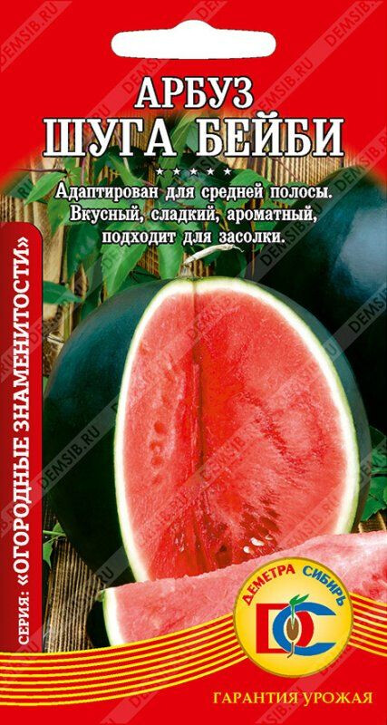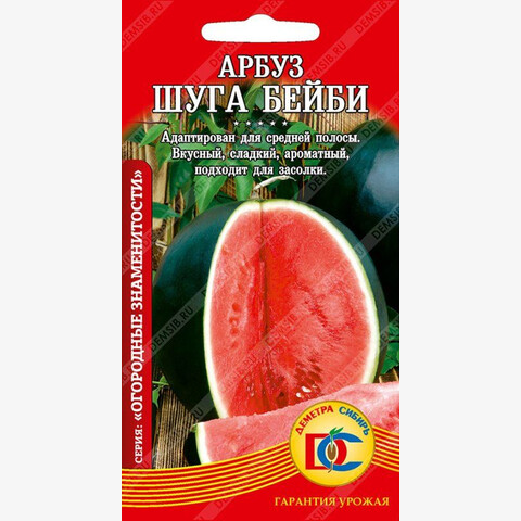 Суперпопулярный сорт САХАРНЫЙ МАЛЫШ. Ультраранний (75-85 дней). Растение короткоплетистое. Плоды круглые, темно-зеленые, с более темными полосами, массой 3-5 кг, с мелкими семенами. Мякоть ярко-красная, нежная, зернистая, очень сладкая и сочная. Сорт ценится за неприхотливость в выращивании и высокую урожайность.