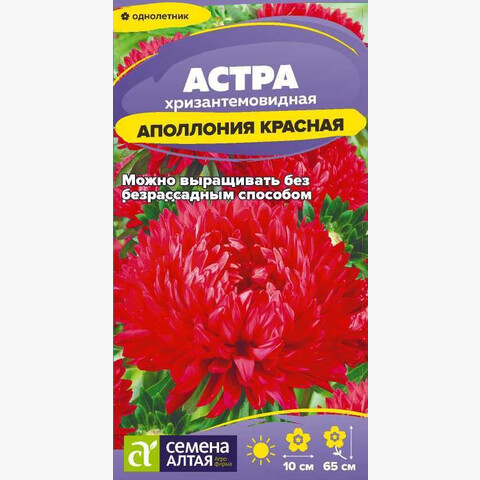 Необыкновенное изящество и нежность окрасок – хризантемовидные астры серии Аполлония! Куст компактный, высотой до 65 см. Каждое растение формирует до 10 цветоносов. Густомахровые соцветия образованы множеством лентовидных язычковых лепестков, равномерно распределенных и создающих четкую полусферу. Соцветия сочной красной окраски, светлеющей к кончикам лепестков, крупные, достигающие в диаметре 10 см. Отлично смотрится в высоком бордюре, на смешанной клумбе или в групповой посадке на газоне, долго стоит в срезке. Холодостойкое, светолюбивое растение, может расти в полутени. Не выносит переувлажнения и засухи. Хорошо растет на обычной садовой почве без свежей органики, кислые почвы необходимо нейтрализовать известью. Семена на рассаду высевают в марте-апреле, глубина заделки 0,5 см. Для улучшения всхожести рекомендуется перед посевом замочить семена на 10 минут в спиртосодержащей жидкости. Посевы содержат при температуре +15-18°С. Сеянцы пикируют с появлением первой пары настоящих листочков. В открытый грунт рассаду высаживают во второй половине мая. Перед высадкой в открытый грунт её закаливают в течение 1-2 недель, снизив температуру до +10°С. Схема посадки 30х30 см. Возможен посев семян в открытый грунт в конце апреля под временное укрытие на глубину 0,5-1,0 см (с последующим прореживанием всходов), или под зиму (в конце октября) на глубину 3 см. Сверху посевы мульчируют торфом или опилками слоем 3-5 см. Весной посевы раскрывают. Цветение длится с июля до конца сентября. Необыкновенное изящество и нежность окрасок – хризантемовидные астры серии Аполлония! Куст компактный, высотой до 65 см. Каждое растение формирует до 10 цветоносов. Густомахровые соцветия образованы множеством лентовидных язычковых лепестков, равномерно распределенных и создающих четкую полусферу. Соцветия сочной красной окраски, светлеющей к кончикам лепестков, крупные, достигающие в диаметре 10 см. Отлично смотрится в высоком бордюре, на смешанной клумбе или в групповой посадке на газоне, долго стоит в срезке. Холодостойкое, светолюбивое растение, может расти в полутени. Не выносит переувлажнения и засухи. Хорошо растет на обычной садовой почве без свежей органики, кислые почвы необходимо нейтрализовать известью. Семена на рассаду высевают в марте-апреле, глубина заделки 0,5 см. Для улучшения всхожести рекомендуется перед посевом замочить семена на 10 минут в спиртосодержащей жидкости. Посевы содержат при температуре +15-18°С. Сеянцы пикируют с появлением первой пары настоящих листочков. В открытый грунт рассаду высаживают во второй половине мая. Перед высадкой в открытый грунт её закаливают в течение 1-2 недель, снизив температуру до +10°С. Схема посадки 30х30 см. Возможен посев семян в открытый грунт в конце апреля под временное укрытие на глубину 0,5-1,0 см (с последующим прореживанием всходов), или под зиму (в конце октября) на глубину 3 см. Сверху посевы мульчируют торфом или опилками слоем 3-5 см. Весной посевы раскрывают. Цветение длится с июля до конца сентября.