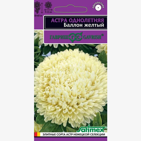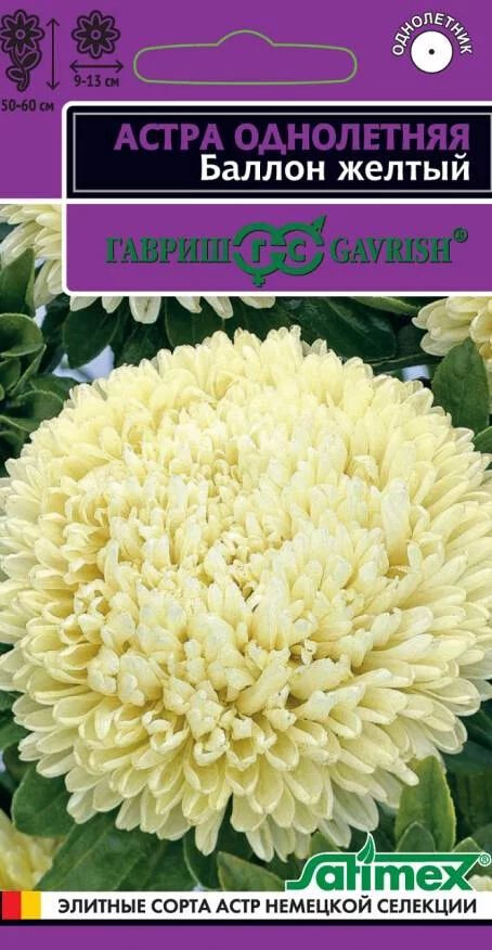 Легендарная серия астр Balloon (Воздушный шар) превосходит все известные сорта по степени махровости и плотности шаровидных соцветий. Растение пирамидальной формы, высотой 50-60 см с прочными цветоносами. На одном растении формируется до 6-8 соцветий изумительного ванильно-желтого оттенка, диаметром 9-13 см. Выращивают чаще всего рассадным способом. Семена высевают в марте-апреле, пикируют с развитием первой пары настоящих листочков по схеме 5х5 см, в открытый грунт рассаду высаживают с середины мая до начала июня. Возможен посев семян в открытый грунт ранней весной или под зиму с последующим мульчированием торфом или опилками. Блистательные астры серии Баллон отличаются великолепными срезочными свойствами, до двух недель стоят в воде, сохраняя декоративность. Прекрасно подойдут для оформления цветников.