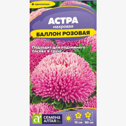 Астра Баллон - это настоящий воздушный шар! Серия превосходит все махровые астры, степень ее махровости неописуема. Благодаря густо расположенным лепесткам ладьевидной формы, капли дождя не проникают в цветок, а скатываются с него! Растение пирамидальной формы, высотой 50-60 см, с прочными цветоносами. Соцветия плотные шаровидные насыщенного розового цвета, диаметром 10-13 см, по 6-8 шт. на растении. Великолепно подходят для оформления клумб и рабаток. В срезке сохраняют свои декоративные свойства до двух недель. Холодостойкое, светолюбивое растение, может расти в полутени. Не выносит переувлажнения и засухи. Хорошо растет на обычной садовой почве без свежей органики, кислые почвы необходимо нейтрализовать известью. Семена на рассаду высевают в марте-апреле, глубина заделки 0,5 см. Для улучшения всхожести рекомендуется перед посевом замочить семена на 10 минут в спиртосодержащей жидкости. Посевы содержат при температуре +15-18°С. Сеянцы пикируют с появлением первой пары настоящих листочков. В открытый грунт рассаду высаживают во второй половине мая. Перед высадкой в открытый грунт её закаливают в течение 1-2 недель, снизив температуру до +10°С. Схема посадки 25х25 см. Возможен посев семян в открытый грунт в конце апреля под временное укрытие на глубину 0,5-1,0 см (с последующим прореживанием всходов), или под зиму (в конце октября) на глубину 3 см. Сверху посевы мульчируют торфом или опилками слоем 3-5 см. Весной посевы раскрывают. Цветение длится с июля до конца сентября.
