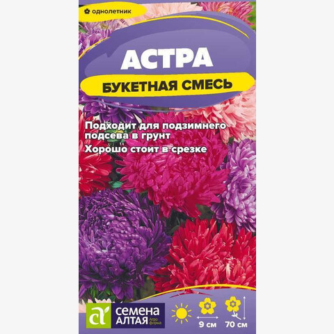 Великолепная смесь! Состоит из сортов астры, долго сохраняющих свежесть в срезке, с ярко окрашенными соцветиями классической формы. Растения компактные, куст цилиндрический, высотой до 70 см. Соцветия многочисленные густомахровые, плоскоокруглые, ярких окрасок, диаметром до 9 см. Используется для украшения различных уголков сада, отлично подходят для срезки. Холодостойкое, светолюбивое растение, может расти в полутени. Не выносит переувлажнения и засухи. Хорошо растет на обычной садовой почве без свежей органики, кислые почвы необходимо нейтрализовать известью. Семена на рассаду высевают в марте-апреле, глубина заделки 0,5 см. Для улучшения всхожести рекомендуется перед посевом замочить семена на 10 минут в спиртосодержащей жидкости. Посевы содержат при температуре +15-18°С. Сеянцы пикируют с появлением первой пары настоящих листочков. В открытый грунт рассаду высаживают во второй половине мая. Перед высадкой в открытый грунт её закаливают в течение 1-2 недель, снизив температуру до +10°С. Схема посадки 30х30 см. Возможен посев семян в открытый грунт в конце апреля под временное укрытие на глубину 0,5-1,0 см (с последующим прореживанием всходов), или под зиму (в конце октября) на глубину 3 см. Сверху посевы мульчируют торфом или опилками слоем 3-5 см. Весной посевы раскрывают. Цветение длится с июля до конца сентября.