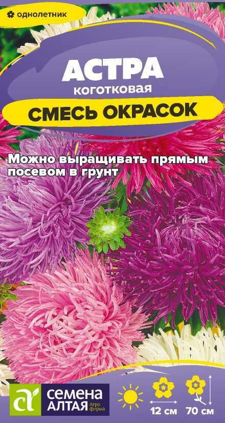 Очаровательная астра с лепестками, словно подхваченными вихрем! Куст колоновидный стройный, высотой 65-70 см, одновременно формирует 10-15 соцветий различной окраски, диаметром до 12 см. Язычковые цветки узкие, скрученные, изгибаясь к диску, полностью закрывают его собой. Используется для составления букетов и украшения садовых композиций, великолепно смотрится в сборных групповых цветниках, на рабатках, в высоких бордюрах. Холодостойкое, светолюбивое растение, может расти в полутени. Не выносит переувлажнения и засухи. Хорошо растет на обычной садовой почве без свежей органики, кислые почвы необходимо нейтрализовать известью. Семена на рассаду высевают в марте-апреле, глубина заделки 0,5 см. Для улучшения всхожести рекомендуется перед посевом замочить семена на 10 минут в спиртосодержащей жидкости. Посевы содержат при температуре +15-18°С. Сеянцы пикируют с появлением первой пары настоящих листочков. В открытый грунт рассаду высаживают во второй половине мая. Перед высадкой в открытый грунт её закаливают в течение 1-2 недель, снизив температуру до +10°С. Схема посадки 30х30 см. Возможен посев семян в открытый грунт в конце апреля под временное укрытие на глубину 0,5-1,0 см (с последующим прореживанием всходов), или под зиму (в конце октября) на глубину 3 см. Сверху посевы мульчируют торфом или опилками слоем 3-5 см. Весной посевы раскрывают. Цветение длится с июля до конца сентября.