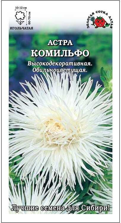 Высокодекоративная астра, цветущая обильно и продолжительно. Куст крепкий, пирамидальный, высотой 60-70 см, формирующий до 8-12 длинных цветоносов. Соцветия очень изящные, полусферической формы, тонколучевые, махровые, чистого белого цвета, крупные, диаметром 10-12 см (до 16 см). Сорт используется для получения высококачественной срезки и оформления всех типов цветников.