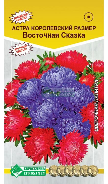Цветение астры всегда ассоциируется с окончанием лета — недаром ее называют осенней розой! Настоящая королева осеннего сада! Даже самый придирчивый садовод скажет, что астра одна из самых красивых букетных цветов, которая могла по достоинству занять не только место на участке, но и в каждом сердце любой женщины. Восточная Сказка - ни с чем несравнимое удовольствие! Она создаст атмосферу праздника в Вашем саду и за свою красоту и нежность по достоинству будет оценена Вами. Завораживающе цветет и долго сохраняет свой привлекательный вид, идеально подходит для различного рода цветников. Соцветия крупные, густомахровые, шаровидной формы диаметром более 12 см, невероятного синего и красного окрасов. Очень красива астра в цветении! Одним из многочисленных достоинств этой серии – высокая устойчивость к болезням и неблагоприятным условиям.