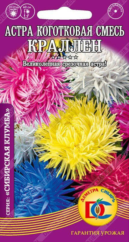 Великолепная смесь, коготковых срезочных сортов астры. Кусты пирамидальной формы, высотой 60 см. Соцветия крупные, махровые, разнообразной окраски, диаметром 10-12 см. Цветение с августа по сентябрь. Используют для посадки в сборные цветники, на рабатки.