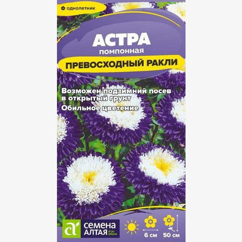 Замечательный сорт, превосходящий прочие по обилию соцветий – до 30 на одном растении. Куст ветвистый колоновидный, высотой до 50 см, с прочными цветоносами. Производит особое впечатление контрастной окраской соцветий с чётким переходом от фиолетово-синего края корзинок к белому центру. Соцветия плоскоокруглые, диаметром 5-6 см. Широкие язычковые цветки расположены в 2-4 ряда по краю соцветия. Центр заполнен длинными трубчатыми цветками, собранными очень плотно. Сорт отлично смотрится при посадке группами в цветниках или рядами в рабатках, великолепен в срезке. Холодостойкое, светолюбивое растение, может расти в полутени. Не выносит переувлажнения и засухи. Хорошо растет на обычной садовой почве без свежей органики, кислые почвы необходимо нейтрализовать известью. Семена на рассаду высевают в марте-апреле, глубина заделки 0,5 см. Для улучшения всхожести рекомендуется перед посевом замочить семена на 10 минут в спиртосодержащей жидкости. Посевы содержат при температуре +15-18°С. Сеянцы пикируют с появлением первой пары настоящих листочков. В открытый грунт рассаду высаживают во второй половине мая. Перед высадкой в открытый грунт её закаливают в течение 1-2 недель, снизив температуру до +10°С. Схема посадки 25х25 см. Возможен посев семян в открытый грунт в конце апреля под временное укрытие на глубину 0,5-1,0 см (с последующим прореживанием всходов), или под зиму (в конце октября) на глубину 3 см. Сверху посевы мульчируют торфом или опилками слоем 3-5 см. Весной посевы раскрывают. Цветение длится с июля до конца сентября.