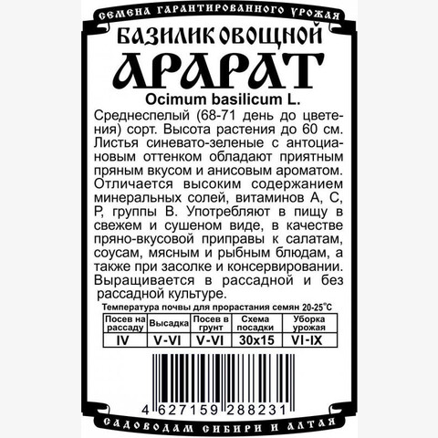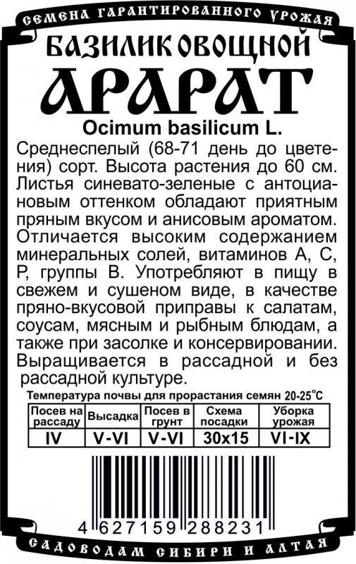 Среднеспелый (68-71 день до цветения) сорт. Высота растения до 60 см. Листья синевато-зеленые с антоциановым оттенком обладают приятным пряным вкусом и анисовым ароматом. Отличается высоким содержанием минеральных солей, витаминов А, С, Р, группы В. Употребляют в пищу в свежем и сушеном виде, в качестве пряно-вкусовой приправы к салатам, соусам, мясным и рыбным блюдам, а также при засолке и консервировании. Выращивается в рассадной и безрассадной культуре.
