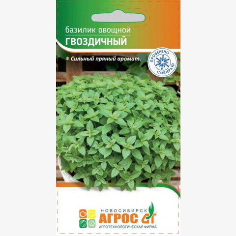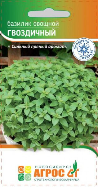 Однолетнее пряно-вкусовое растение. Листья мелкие зеленые плоские с сильным гвоздичным ароматом. В пищу употребляются листья вместе с нежными побегами до цветения. Растения базилика гвоздичного смотрятся очень декоративно и могут использоваться для оформления участка. Широко используются как в свежем, так и в засушенном виде в качестве приправы к мясным и рыбным блюдам, в маринадах и соленьях. Прекрасно подходят для выращивания в горшках, на балконах и лоджиях. Благодаря сильному пряному аромату этот сорт базилика с успехом заменит знакомую и любимую гвоздику в маринадах, соленьях и соусах. Особенности выращивания: культура теплолюбивая, не выносит даже небольшие заморозки. Глубина посева: 1-1,5 см. Зелень срезают в период массового цветения. 40-50 III-IV V-VI VI 10x20 VI-IX