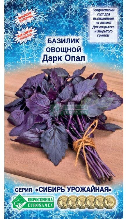 Базилик – настоящая находка для любого огородника, который ищет полезную, красивую и одновременно неприхотливую в выращивании пряность. В кулинарии аромат базилика описывается как пряный запах душистого перца со слегка холодящим солоноватым вкусом. В смеси с другими специями, со многими из которых он прекрасно сочетается, появляются нюансы – так, вкупе с розмарином он приобретает перечный запах, с чабером – усиливает остроту блюда. Базилик улучшает пищеварение, возбуждает аппетит. Дарк Опал- необычный и привлекательный сорт, имеющий очень насыщенный, выраженный гвоздично - перечный аромат, за что и ценится во всем мире. Листочки фиолетовые с пурпурным отливом, широко применяются в салатах, для ароматизации масел и маринадов. Высота куста-40-60 см, сорт среднеспелый (55-60 дней), урожайность зеленой массы с 1 кв.м. составляет 1,1-1,2 кг.