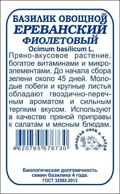 Однолетнее пряно-вкусовое растение, богатое эфирными маслами, солями, витаминами и каротином. От всходов до начала хозяйственной годности около 45 дней. Молодые побеги и крупные листья имеют красно-фиолетовую окраску, обладают гвоздично-перечным ароматом и сильным терпким вкусом. Масса одного растения 300-500 г. Базилик используют в свежем и сушеном виде в качестве пряной приправы к салатам и мясным блюдам, добавляют при консервировании.
