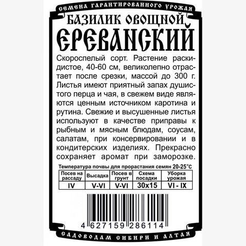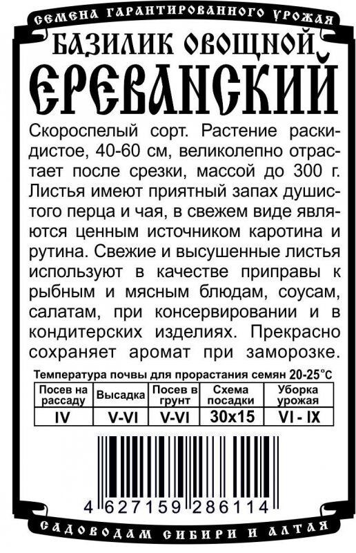 Скороспелый сорт. Растение раскидистое, 40-60 см, великолепно отрастает после срезки, массой до 300 г. Фиолетовые листья имеют приятный запах душистого перца и чая, в свежем виде являются ценным источником каротина и рутина. Свежие и высушенные листья используют в качестве приправы к рыбным и мясным блюдам, соусам, салатам, при консервировании и в кондитерских изделиях. Прекрасно сохраняет аромат при заморозке